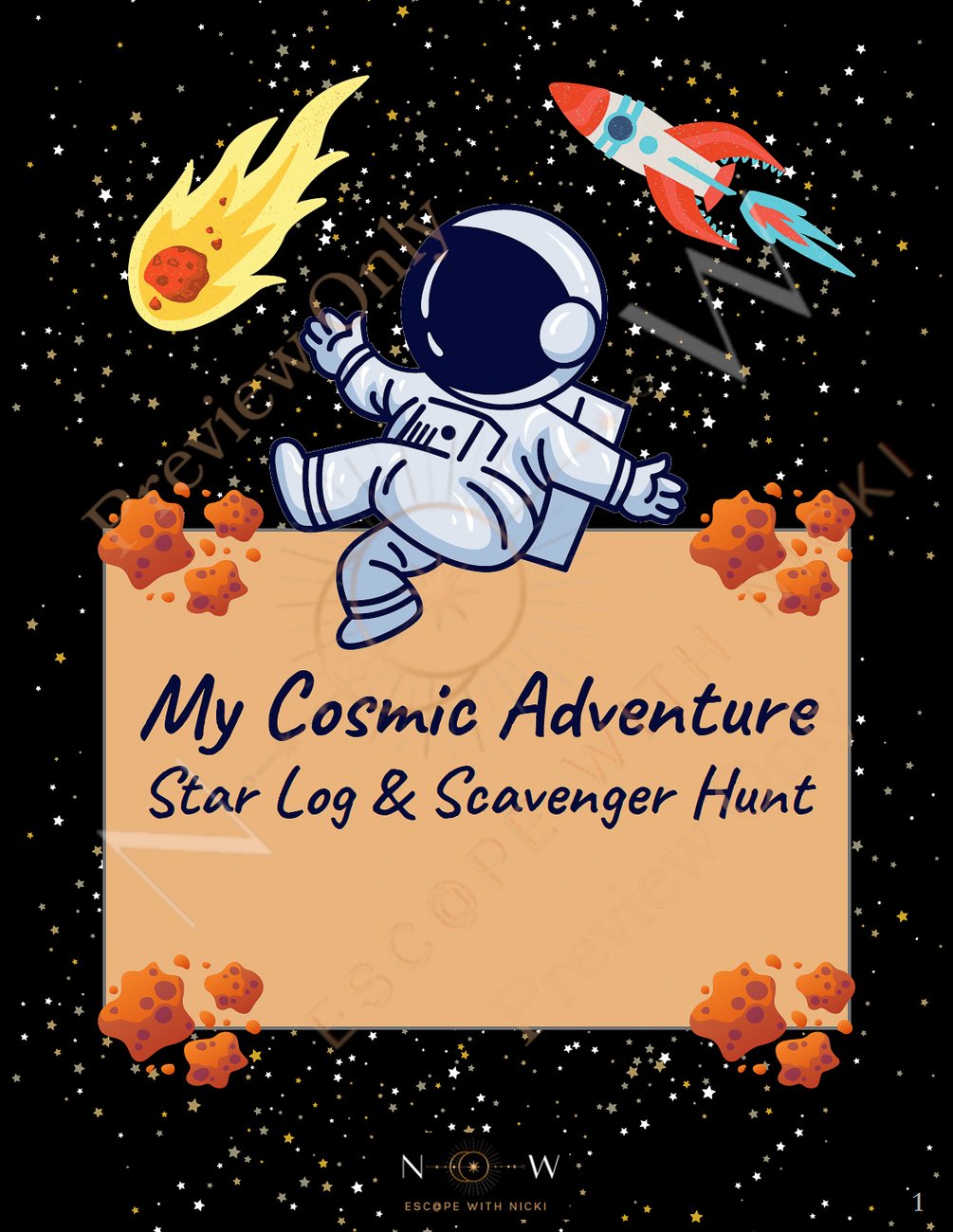The Cosmic Adventure Astronomy Logbook is a 72-page space-themed journal designed for kids ages 5–13 to explore the stars through hands-on missions, seasonal scavenger hunts, observation logs, creative writing, and doodles.