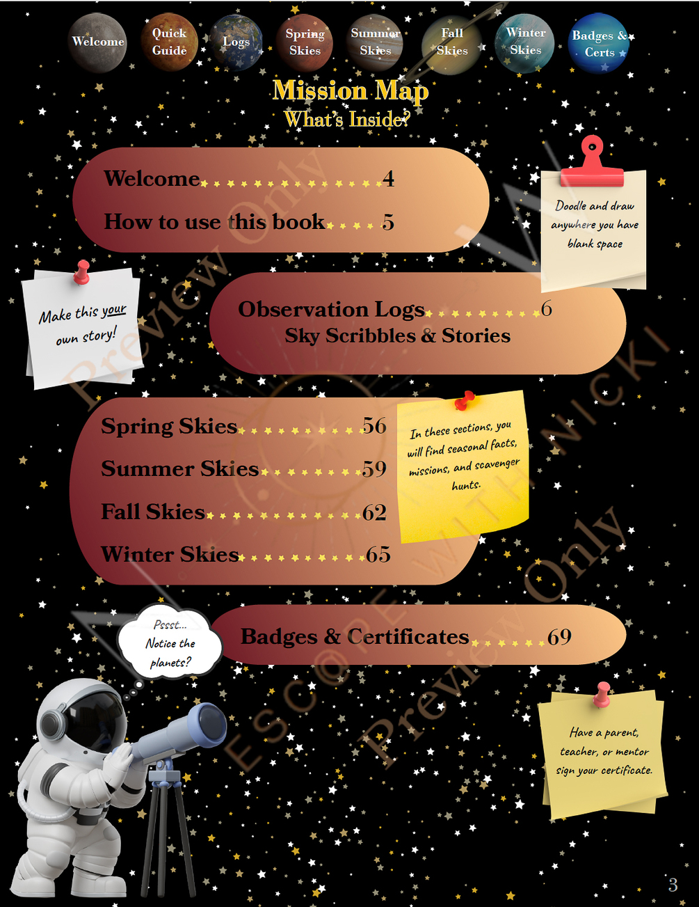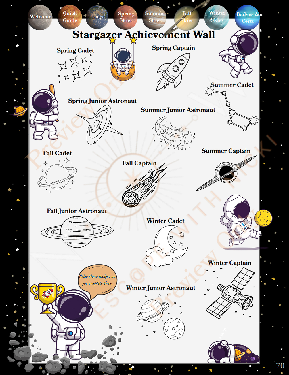 🌠 Seasonal Sky Guides – Kid-friendly overviews of Spring, Summer, Fall, and Winter skies, including meteor showers.